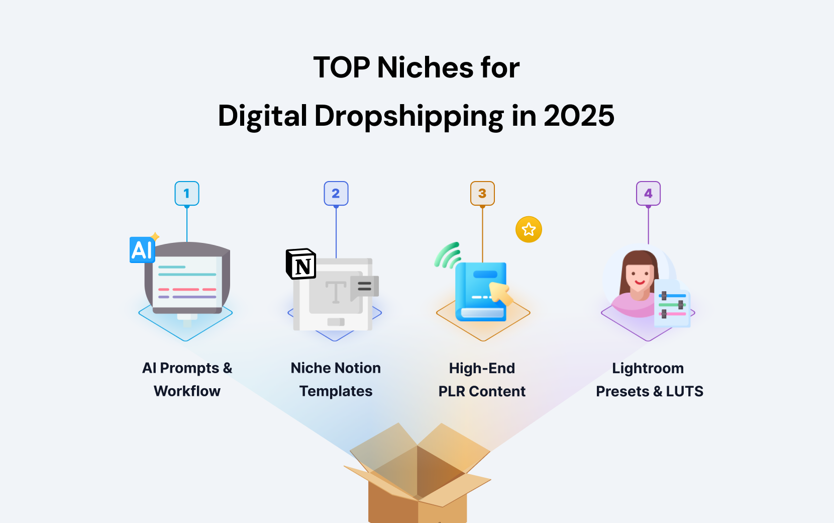Digital dropshipping means selling intangible assets — files, licenses, or content — that customers receive right after the purchase.