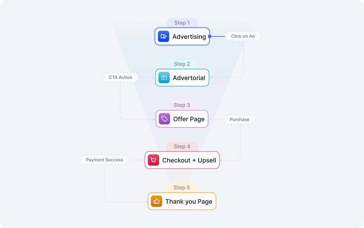 🧭 Ad → Advertorial / Pre-Sell → Offer Page → Checkout → Upsell → Thank You