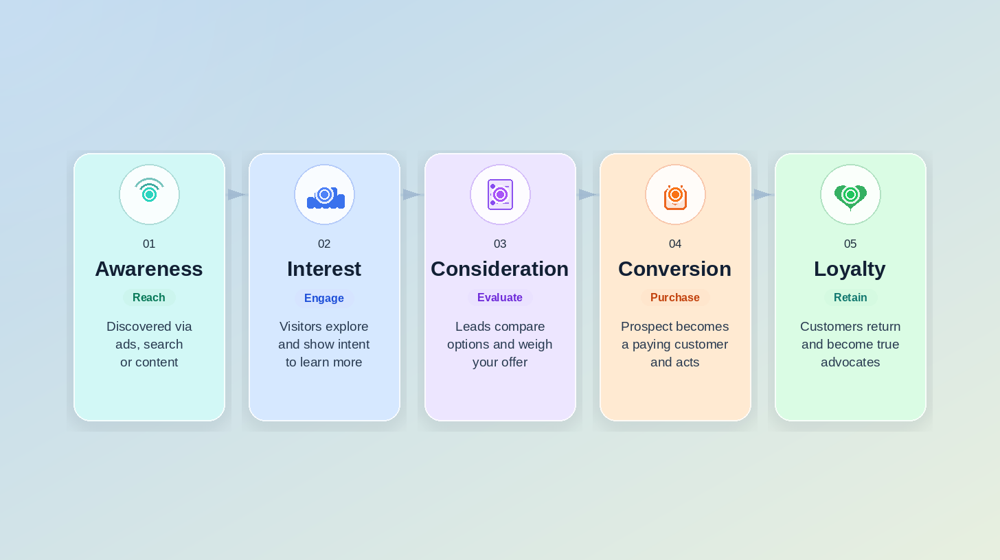 Every product funnel, regardless of industry, follows the same five-stage structure. What changes is the tactic at each stage — the specific content, offer, and mechanism used to move the user to the next stage.