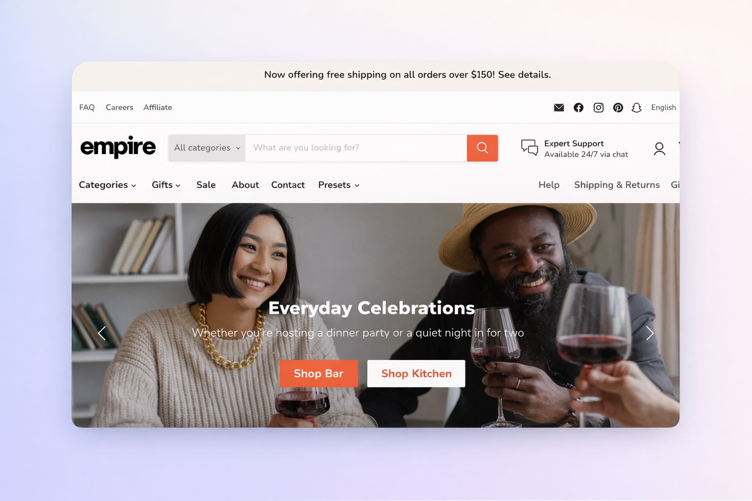 Empire is optimized for big catalogues and is highly chosen by dropshipping businesses because it is designed to handle large inventories with ease — advanced filters and shoppable images are standout features. Its sticky search bar and versatile layout make it easy for customers to find products in stores with hundreds of items. The support from Pixel Union, the developer behind it, is consistently praised in merchant reviews. One-time payment with a lifetime license.