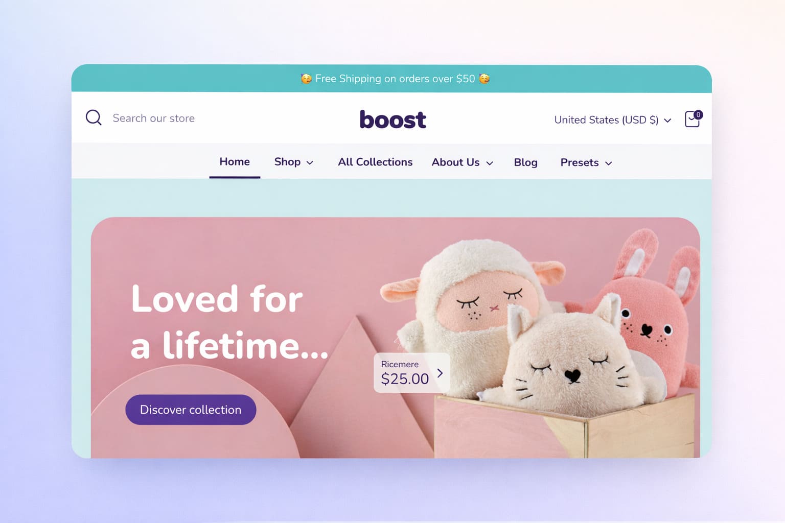 Four ready-made presets (Boost, Flourish, Blossom, Inspire) cover a range of aesthetics. The support team is consistently praised in reviews — one merchant noted they helped solve a week-long issue that wasn't even caused by the theme itself. The one honest gap flagged by merchants: no cart drawer, which is increasingly standard.