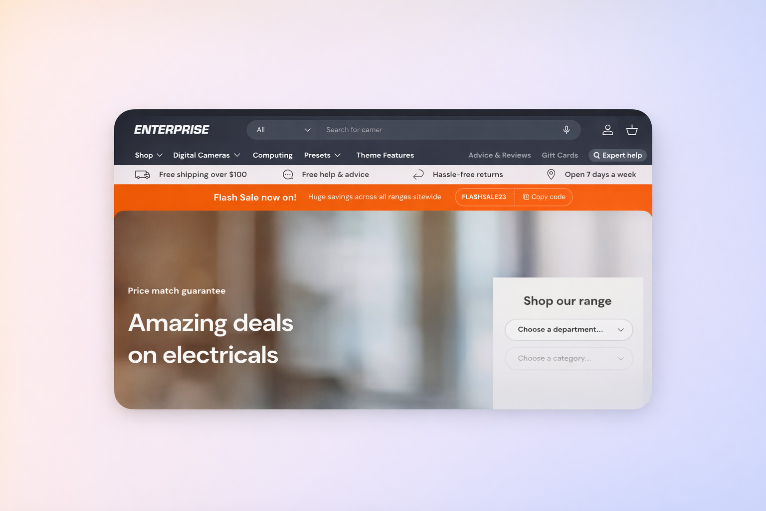 Enterprise is a Shopify theme for large shops with extensive product ranges and complex navigation structures — ideal for retailers with many products, categories, and subcategories who need clear structure. If your Shopify store is more of a retailer than a brand, and your customers need to navigate efficiently across a broad product range, Enterprise is purpose-built for that use case.