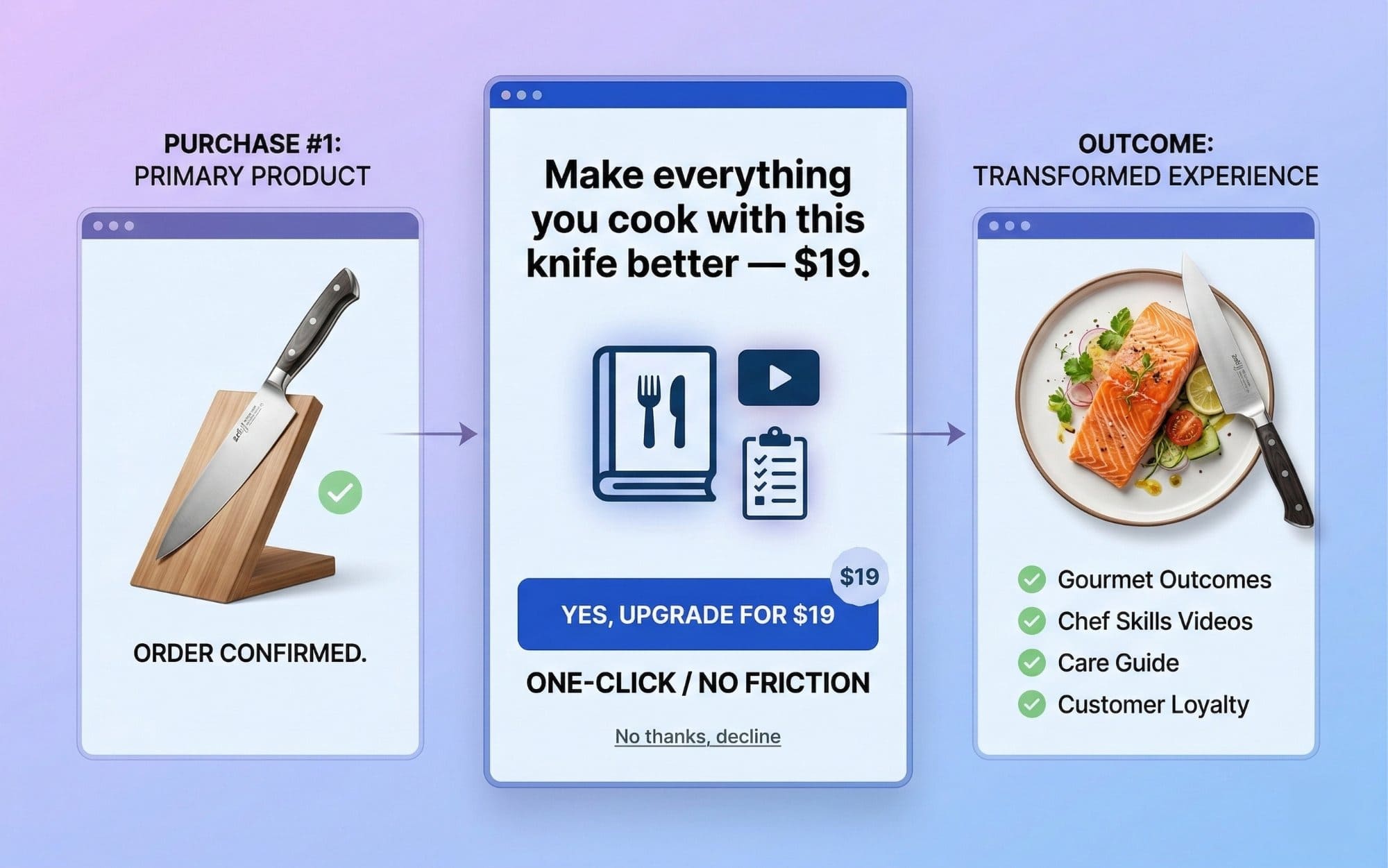A brand selling a high-end chef's knife might offer a post-purchase upsell: a digital cookbook with knife skills recipes, a video series on professional cutting techniques, and a printable knife care guide — bundled for $19. The production cost is near zero once created. The perceived value is high because it's relevant to what the customer just bought. A customer who accepts this offer is also more likely to become a loyal customer who actually uses the product correctly, generates better outcomes, and comes back for repeat business.